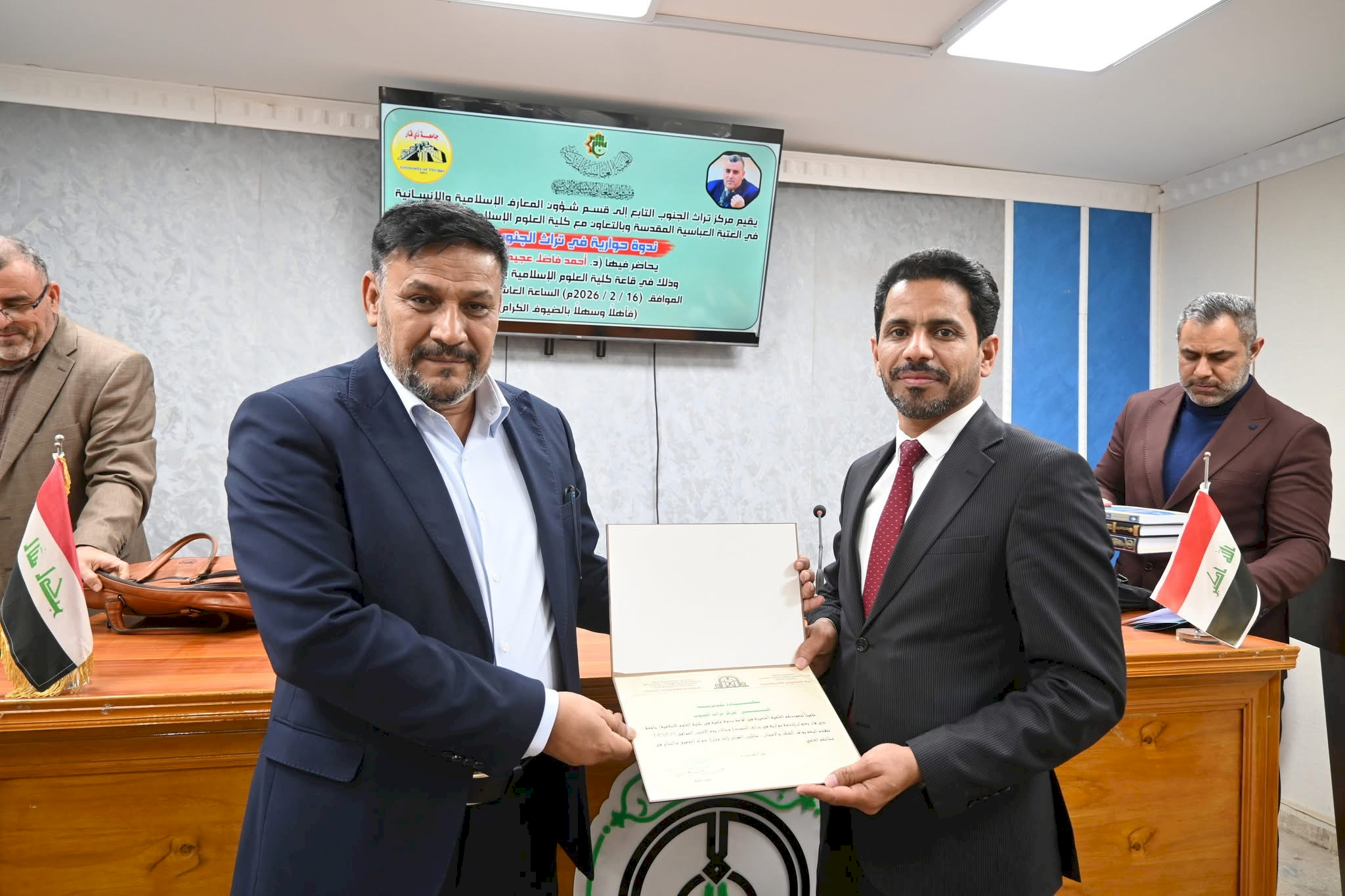 أقام مركزُ تراثِ الجنوب، التابعُ إلى قسمِ شؤونِ المعارفِ الإسلاميّةِ والإنسانيّةِ في العتبةِ العبّاسيّةِ المقدّسة، ندوةً علميّةً حواريّةً بالتعاون مع كليّةِ العلومِ الإسلاميّة في جامعة ذي قار، وذلك صباحَ الاثنين (16 شباط 2026م)، على قاعةِ الكليّة، بحضورِ نخبة من أساتذة الكليّة وطلبتها. وحاضر في الندوة الدكتور أحمد فاضل عجيمي، مستعرضًا أهدافَ المركز في تحقيقِ وتوثيقِ ودراسةِ تراثِ محافظات الجنوب الأربع (ذي قار، ميسان، المثنّى، والديوانيّة)، وإبرازِ دورِ علمائها ورجالاتها في الساحة العلميّة والثقافيّة الإسلاميّة، إلى جانب التعريف بأبرز إصداراته العلميّة. كما تناول المحاضرُ مجلّةَ (تراث الجنوب) المُحكّمة، مشيرًا إلى اعتمادها من وزارة التعليم العالي والبحث العلميّ لأغراض الترقية العلميّة، وصدور ستة أعدادٍ منها، داعيًا الباحثين وطلبة الدراسات العليا إلى نشر دراساتهم المعنيّة بتاريخ المنطقة وتراثها في المجلَّة. من جانبه، أكّد مديرُ المركز الأستاذ الدكتور حسين عليّ الشرهانيّ انفتاحَ المركز على المؤسّسات الجامعيّة، واستعداده لتعزيز آفاق التعاون العلميّ معها، وأجاب عن تساؤلات الحاضرين، وحثَّهم على رفد المركز بالدراسات والوثائق والمخطوطات؛ حفظًا لتراث الجنوب وصونًا له. يُذكر أنَّ الندوةَ شهدت نقاشًا علميًّا وتفاعلًا من الأساتذة والطلبة، الذين أشادوا بجهود العتبة العبّاسيّة المقدّسة في إحياء التراث الجنوبيّ وتعزيزه.