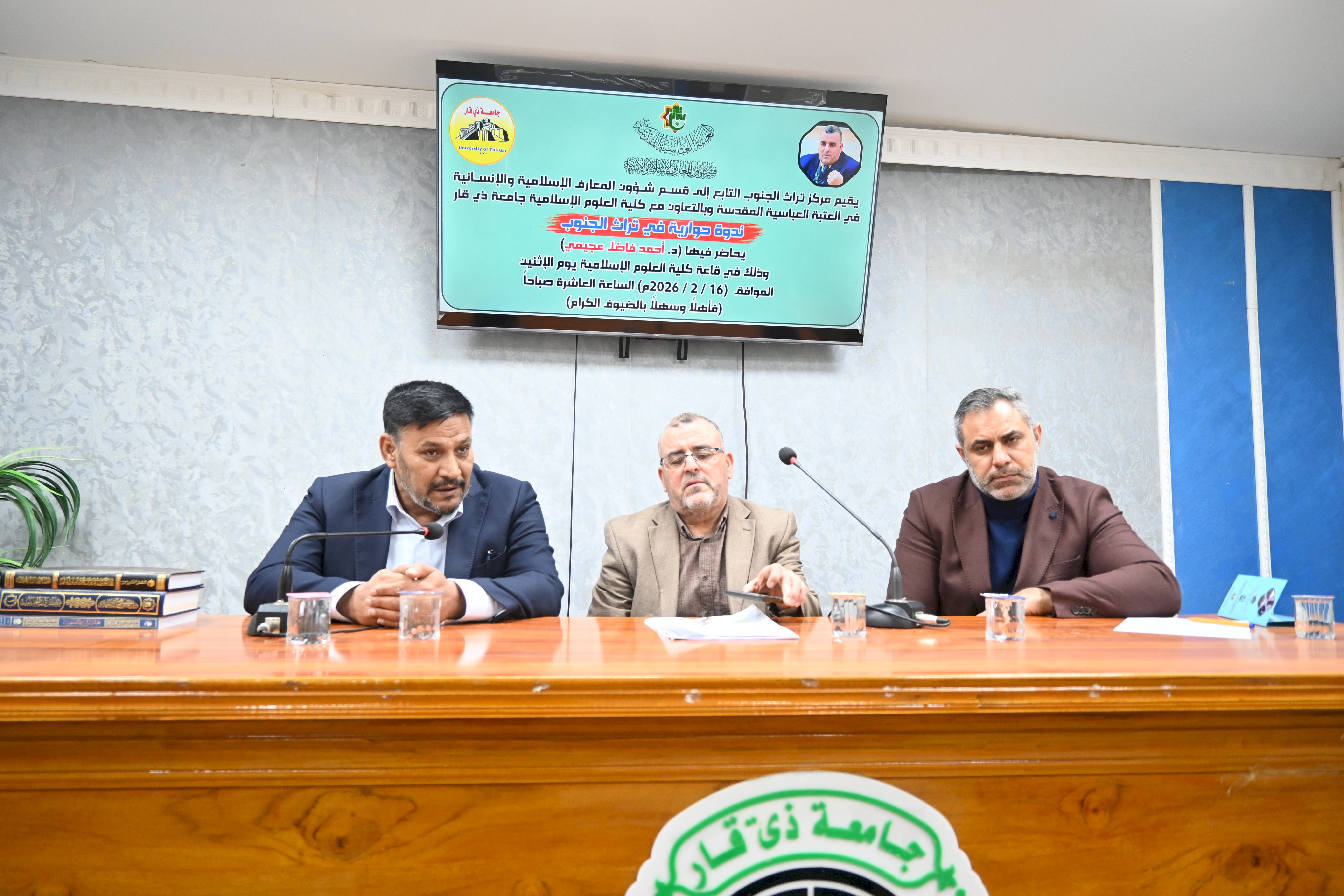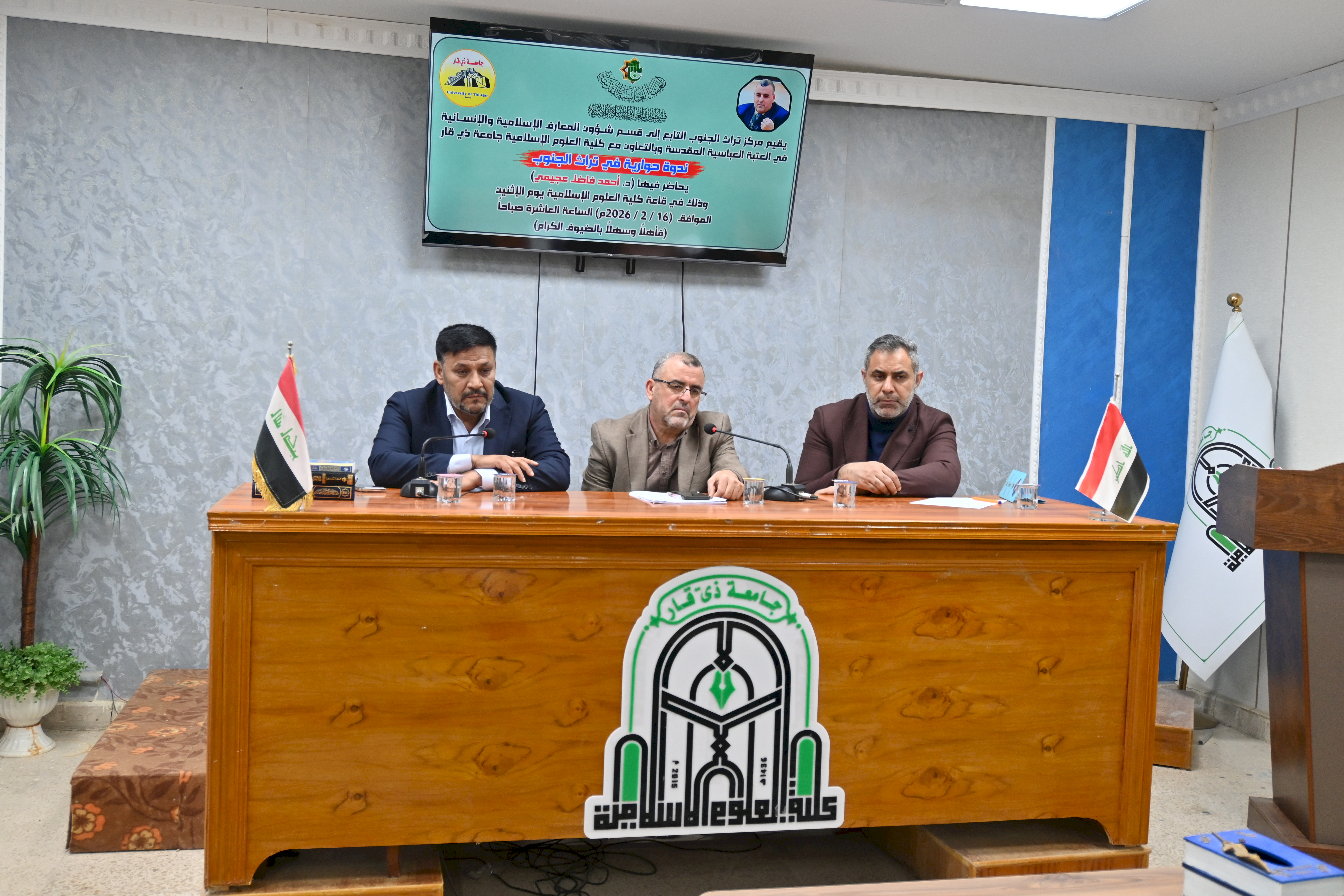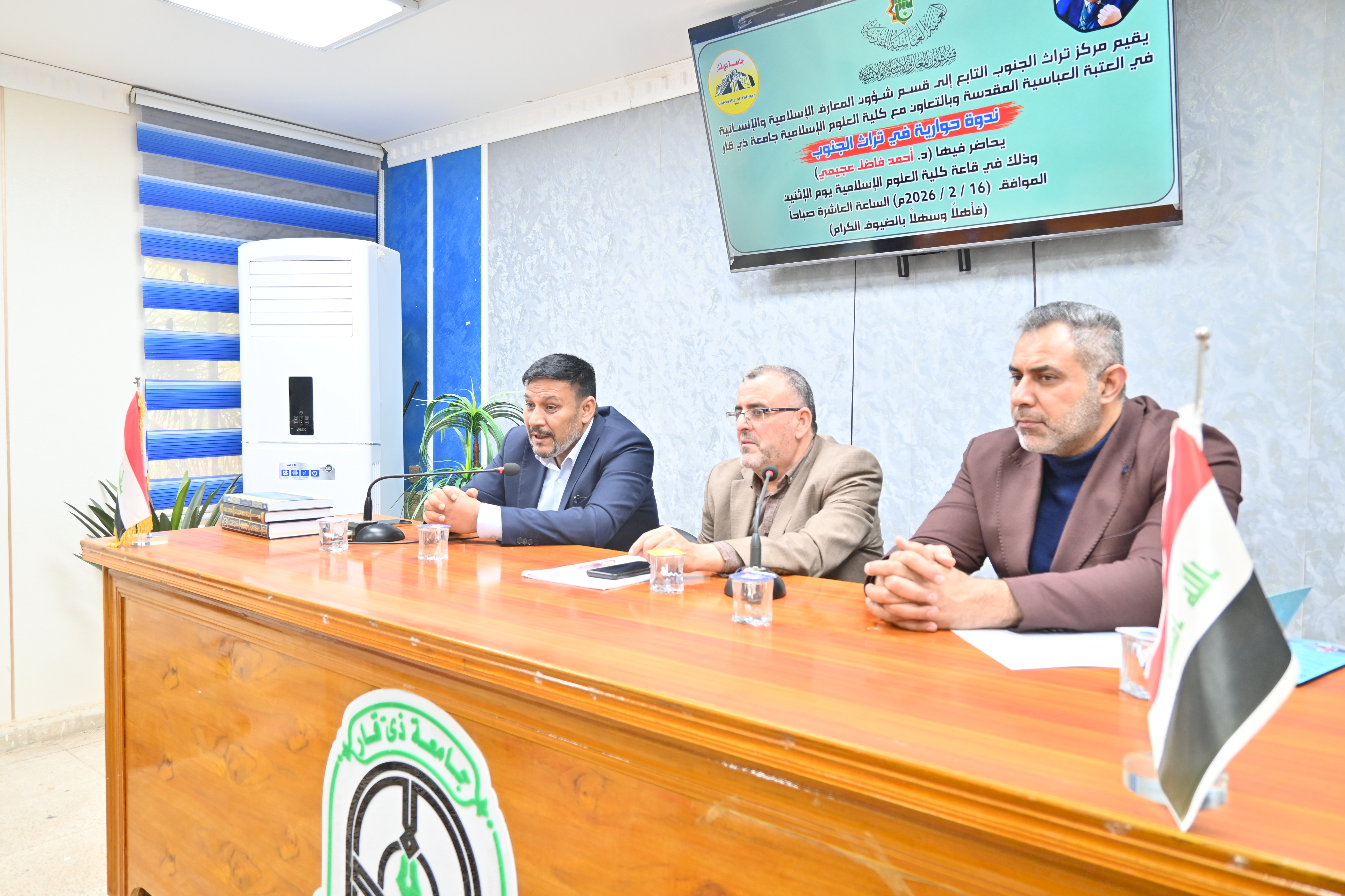 مركز تراث الجنوب يقيم ندوة حوارية بالتعاون مع كلية العلوم الإسلاميّة سعيًا منه لمدّ جسور التواصل العلميّ والمعرفيّ مع المؤسسات الأكاديمية، والتعريف بالخزين المعرفي لمحافظات الجنوب، أقام مركزُ تراث الجنوب التابع إلى قسم شؤون المعارف الإسلاميّة والإنسانيّة في العتبة العبّاسيّة المقدّسة، وبالتعاون مع كلية العلوم الإسلاميّة في جامعة ذي قار، صباح اليوم الإثنين الموافق (16 شباط 2026م)، ندوةً علميةً حوارية في تراث الجنوب، حاضر فيها (د. أحمد فاضل عجيمي) وبحضور السيد مدير المركز الأستاذ الدكتور (حسين عليّ الشرهانيّ) وذلك على قاعة الكلية، وسط حضورٍ أكاديمي وطلابي مميز. استهلّ الدكتور (أحمد فاضل عجيمي) الندوة بالتعريف بمركز تراث الجنوب واهتمامه بتحقيق تراث المحافظات الأربع (ذي قار، ميسان، المثنى، والديوانيّة)، وتوثيقه ودراسته ونشره، مسلطاً الضوء على رؤيته ورسالته الهادفة إلى تعزيز أصالة الهوية والانتماء، وإبراز دور العلماء والأسر والرجالات الجنوبيين وأثرهم في الساحة العلميّة والثقافية الإسلامية، إلى غير ذلك من أوجه التراث الأخرى. ومستعرضاً في الوقت ذاته أبرز الإصدارات التي رفد بها المركز المكتبة الإسلاميّة والمعرفيّة وما هو في طور الإنجاز. وفي سياق متصل، أفرد الدكتور العجيمي مساحةً واسعة للحديث عن مجلّة (تراث الجنوب) المحكّمة، مبيناً أنها منصة علمية حاصلة على اعتماد وزارة التعليم العالي والبحث العلميّ لأغراض الترقية العلميّة، وتخضع لإشراف هيئة تحرير متخصصة، وقد صدر منها حتى الآن (ستة أعداد) شكلت مساراً تصاعدياً في البحث العلميّ، داعياً في الوقت ذاته الباحثين وطلبة الدراسات العليا إلى استثمار هذه المنصة البحثية لنشر دراساتهم التي تُعنى بتاريخ المنطقة وتراثها ورجالاتها. وفي ختام الندوة الحوارية، اعتلى المنصةَ مديرُ مركز تراث الجنوب الأستاذ الدكتور (حسين عليّ الشرهانيّ)، مؤكدا على انفتاح المركز على الأوساط الجامعية، ومجيباً عن تساؤلات الحاضرين واستفساراتهم حول آليات العمل والتعاون، وموجهاً دعوة للباحثين والمهتمين بالشأن التراثي للتواصل مع المركز وتزويده بما تجود به أقلامهم، أو ما يملكونه من وثائق ومخطوطات؛ لغرض حفظها ودراستها بما يليق بمكانة الجنوب وتراثه. وشهدت الندوة تفاعلاً ونقاشاً علميًّا ثرياً من قبل الأساتذة والطلبة الحاضرين، الذين أبدوا اعجابهم بالمنجز النوعي للمركز، مثمنين جهود العتبة العبّاسيّة المقدّسة في إحياء هذا التراث الثرّ، منوهين إلى بعض المشاريع البحثية التي يمكن أن تكون خطوة أولى في تحقيق ذلك التعاون العلمي المنشود.